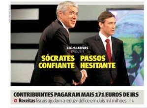 Quando o Emídio Rangel, em estado de choque, afirma na televisão que ficou surpreendido com a prestação de Passos Coelho; quando o insuspeito Miguel Sousa Tavares afirma, na televisão, que Passos Coelho esmagou Sócrates; quando todos os comentadores se dividiram entre o empate (os mais próximos de Sócrates) e a vitória de Passos Coelho (os mais próximos de PPC e os vários independentes), o director interino do JN, Manuel Tavares (ex-director do Jogo), escreve no DN que Sócrates ganhou e coloca um título absolutamente surpreendente, para não dizer abjecto e abaixo de cão*, no Jornal de Notícias:
